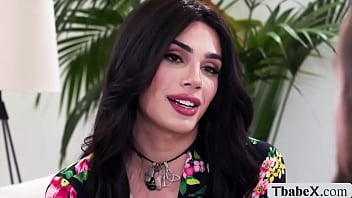 Tall brunette shemale Lianna Lawson flirts with her hunk stepbrother and kisses him pulling out his big cock and blowjobs deepthroat it.