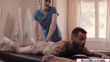Trans nurse Lianna Lawson gives massage to a patient and he gets hot.The tgirl fingers his ass and gives him a footjob.Then the shemale barebacks him