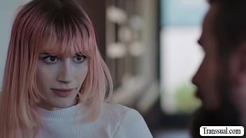 Pink haired TS comforted by her new stepfather by letting her suck his hard dick.In return,he licks and barebacks her ass so deep and hard.