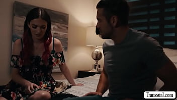 Slut shemale goes to the room of her stepbrother and she then throats his hard dick passionately.In return,he bareback fucks her wet ass so hard.