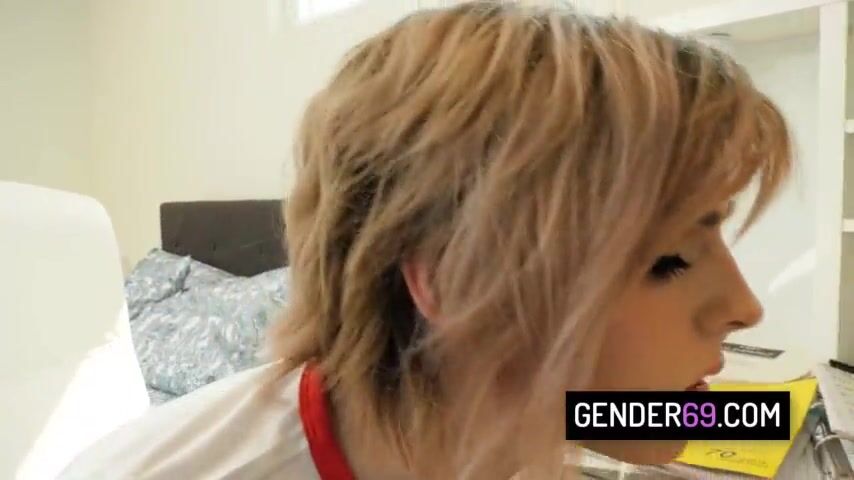 Sexy shemale teen slut barebacks and gives a rimjob to her shemale roommate