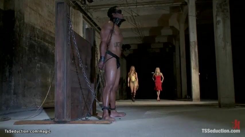 Two super hot Latina women with big dicks Johanna B and Paris A have tanned muscle Lobo bound then with hard cocks then gang bang him while he is deprived of movement