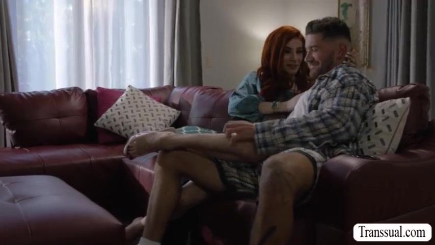 Redhead trans woman brings her mistress while her husband is working.They start kissing and she then throats his dick and rides it after.
