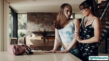 Tall shemale Melanie Brooks flirts with petite stepdaughter Izzy Wilde and go to bed where they kiss while undressing lingeries.