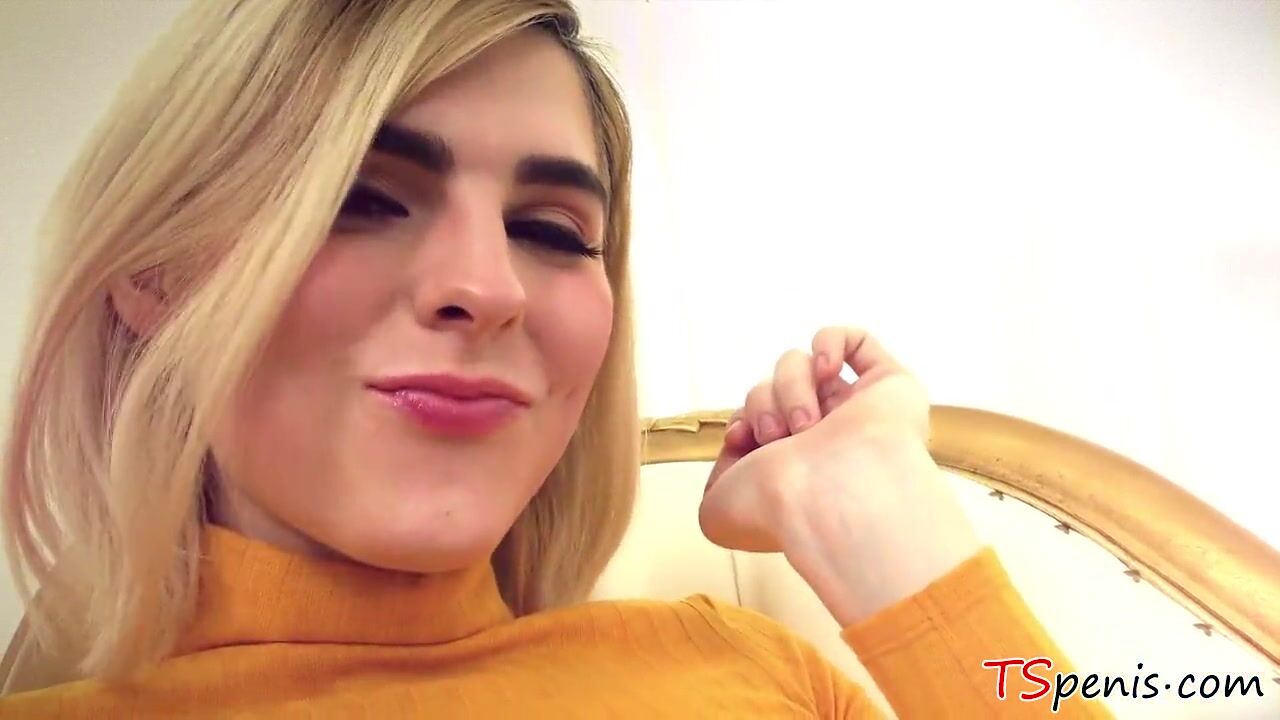 Pale, super-cute TS Ella Hollywood playfully teases in black heels, a tight top, and bulging white panties. The tiny blonde masturbates, caressing the tip of her she-dick; she tastes her sweet pre-cum