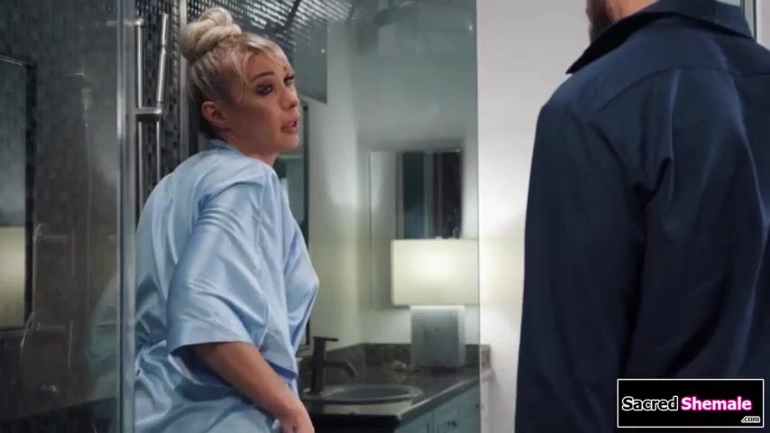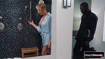 Big tits trans Aubrey Kate calls a plumber to fix her shower and the tgirl bends over to show him the toy in her ass.He rims the ts and barebacks her