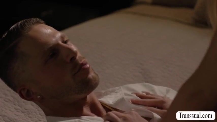 Hot blonde TS Gracie Jane wears a seductive lingerie and start kissing her new boyfriend.After that,she throats his cock and lets him fuck her ass.