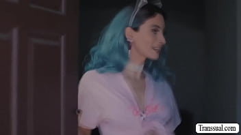 Horny shemale invites her neighbor to come in her house and lets him watch while shes toying her ass.After that,she lets him bareback her wet ass.
