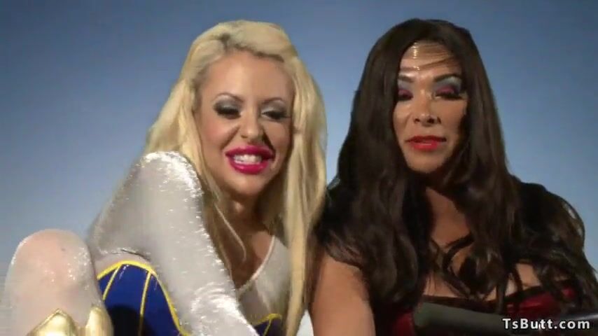 Tied up dude dressed in red latex gets cock rode by sexy blonde Courtney Taylor while busty shemale Vaniity bangs his mouth then they fuck each other