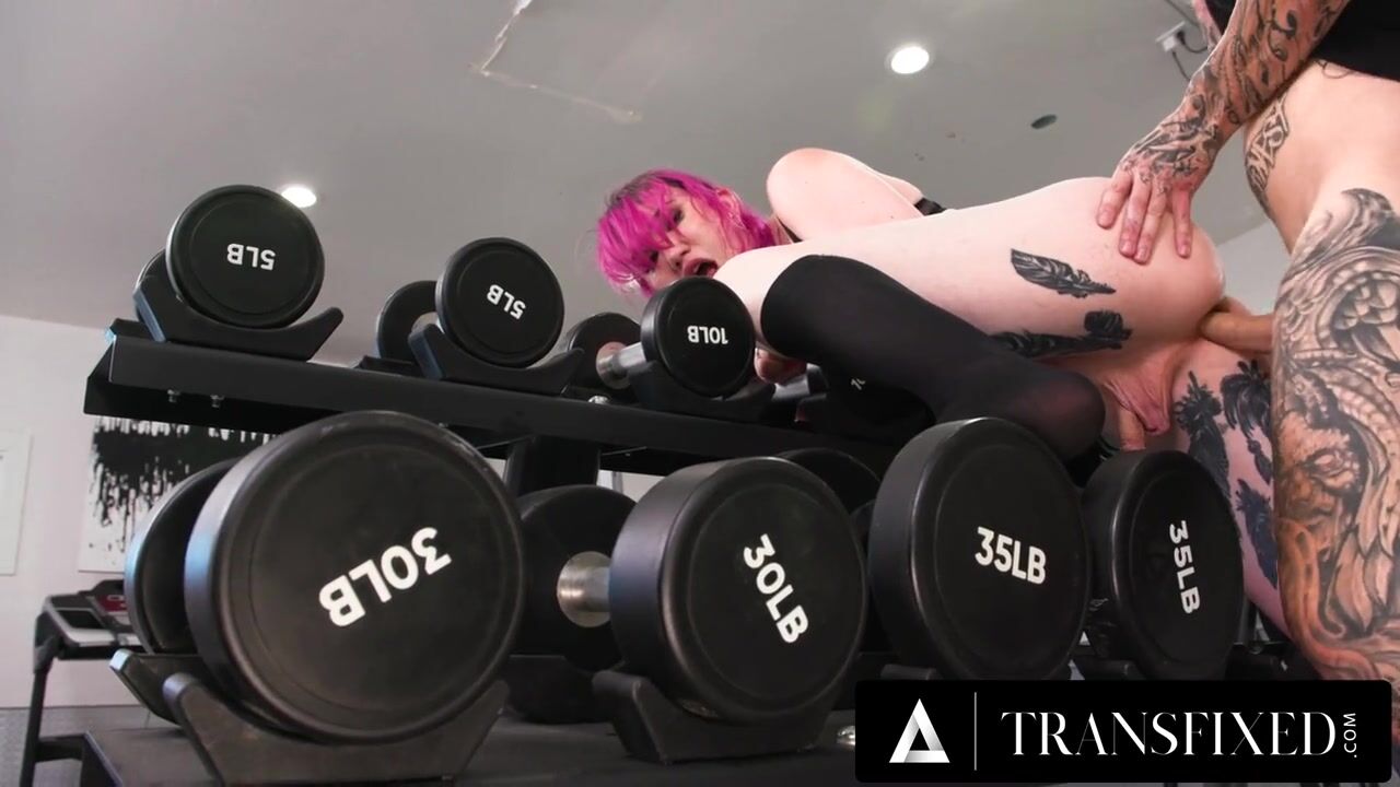 Pink haired hottie Lena Moon drops her phone in the gym and gets STUCK picking it up. Gym buddy Hatler Gurius takes advantage and barebacks her ass!