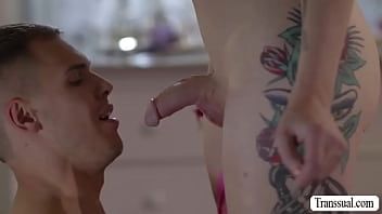 Redhead shemale and her new guy are on the bed kissing each other.Next is,she lets her guy throat her hard tranny cock passionately.In return,she licks his ass first to makes it wet and she then bareback fucks it so deep and hard.