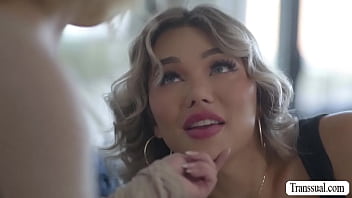 Wealthy shemale shows her room to her busty friend and she then licks her pussy.After that,she lets her friend suck her shecock and rides it.