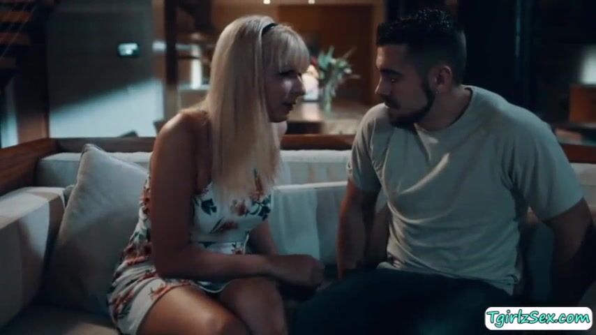 Muscular straight guy Dante Colle flirts with busty blonde shemale Jamie French in the couch kisisng and tti sucking her big boobs.