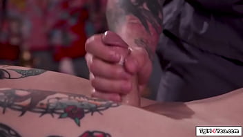Masseur gives massage to tattooed trans Janie Blade and the redhead ts asks him to stroke her tranny cock.The big tits tgirl is rimmed and barebacked