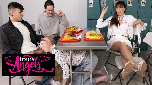 trans - Janelle Fennec Goes Under The Table & Sucks Her Friend's Dick After Eating Lunch