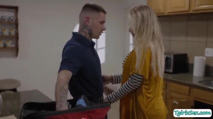 Zac Bishop is approached by blonde shemale Emma Rose pulling down his spants and gives his ass a rimjob then the tall tgirl bareback anal doggystyle.